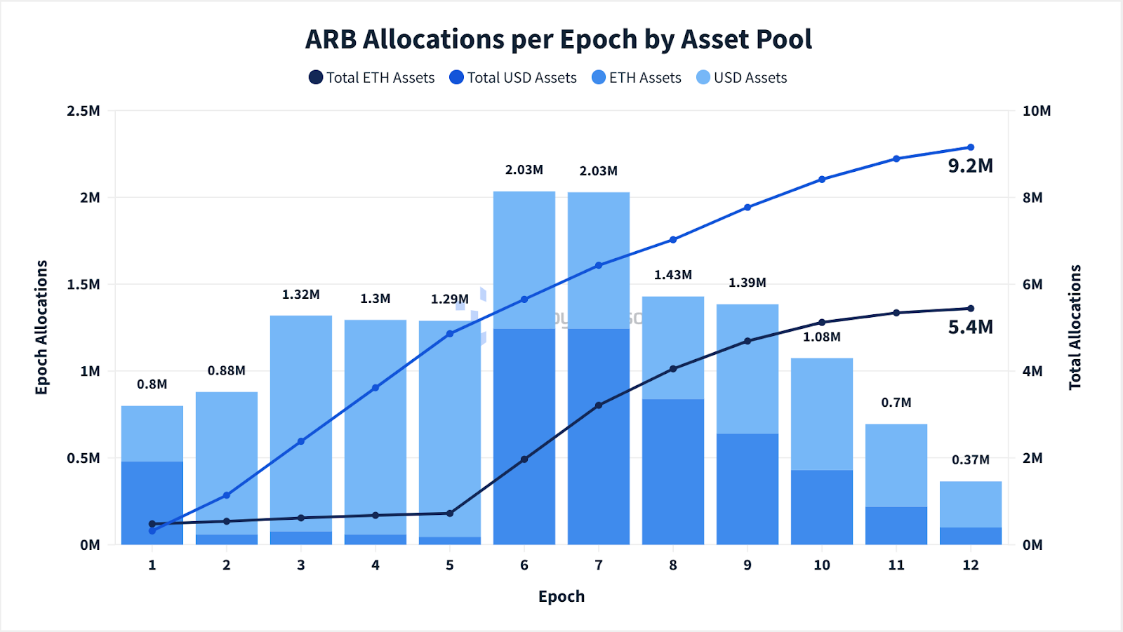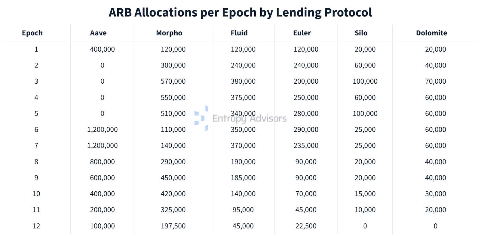 From September 2025 to February 2026, over the course of 12 two-week epochs, the DRIP program deployed 14.6M ARB (approx. $4M at allocation) across six lending protocols: Aave, Morpho, Fluid, Euler, Dolomite, and Silo, as well as two ETH and USD yield-bearing asset pools.
