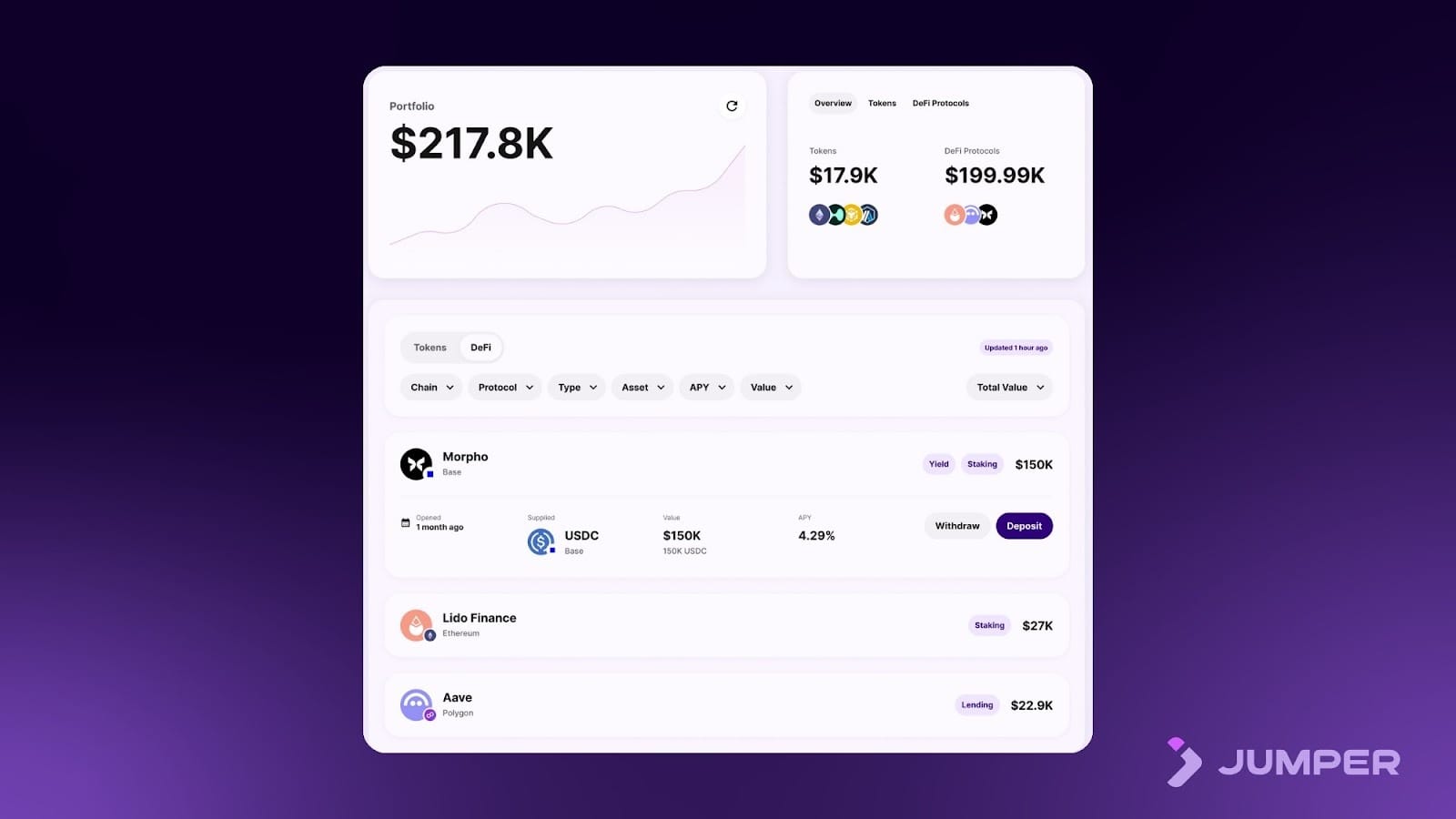 To manage this in a simple way, Jumper Portfolio offers a unified dashboard for users to monitor and rebalance their assets and DeFi positions seamlessly across chains, without leaving the platform. It eliminates the need to juggle multiple wallets or interfaces, providing real-time insights into token balances, current positions, and overall portfolio performance.