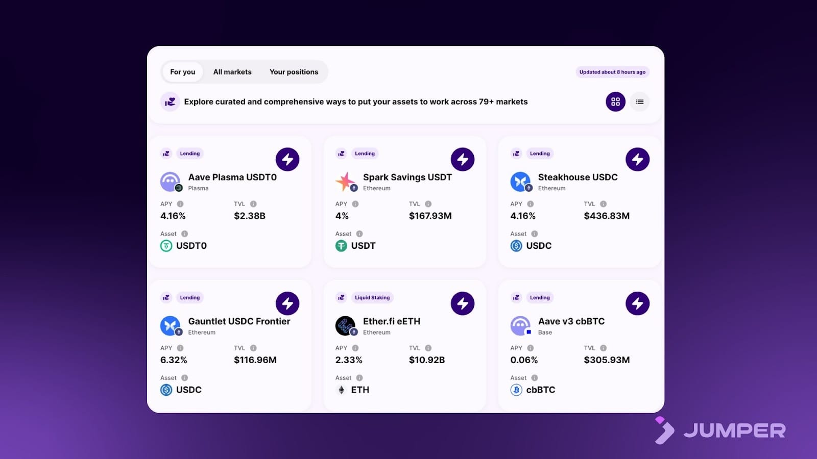 Jumper Earn’s yield aggregation engine analyzes 100+ pools across 15 top DeFi protocols, and then presents a personalized feed to each user based on wallet holdings, behavior, and preferences. Get aggregated recommendations, select the ones you like, and never worry about missing out on a yield offering again.