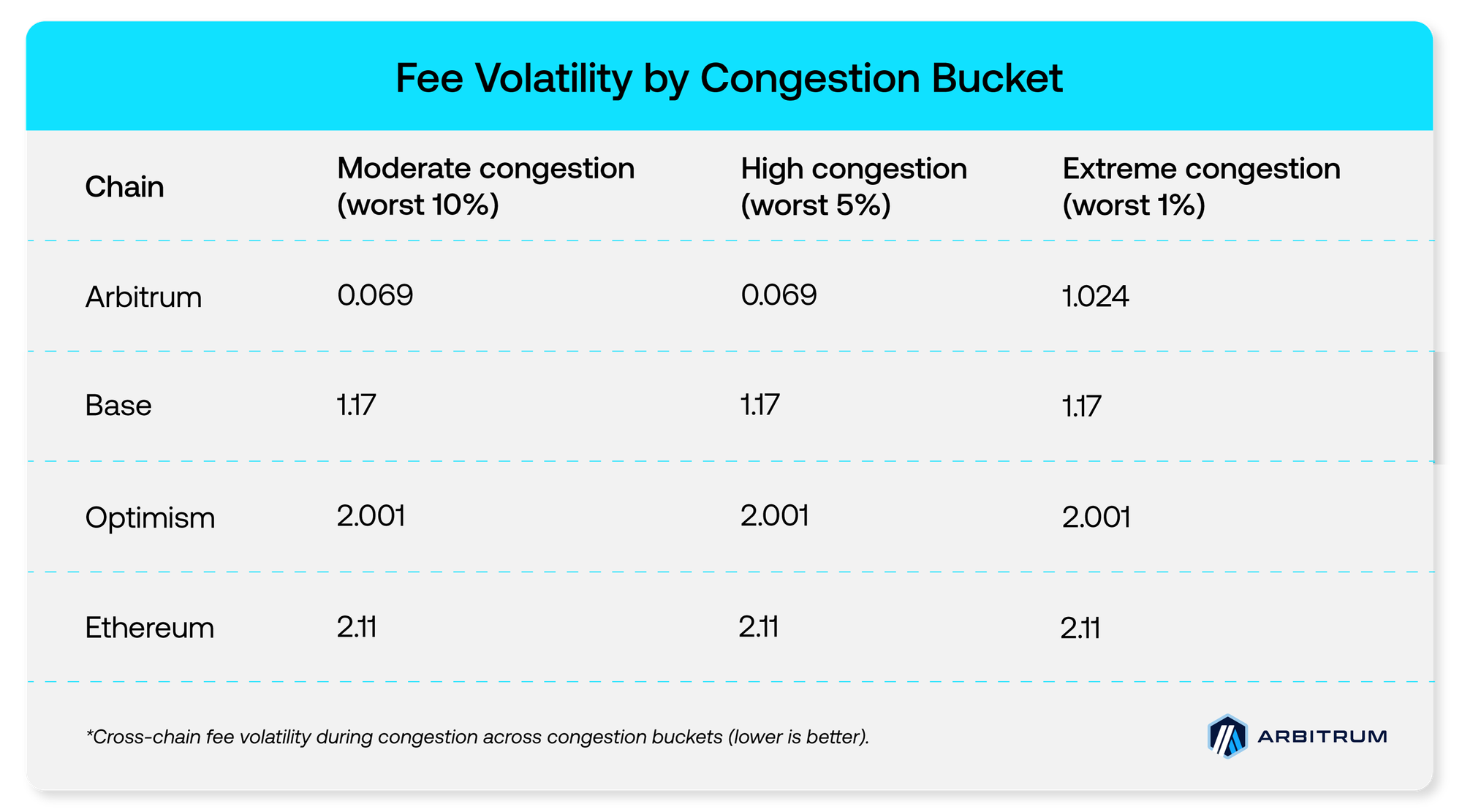 - Lower fee volatility under congestion: Arbitrum showed lower fee volatility scores across all congestion buckets (moderate, high, and extreme) in this dataset.