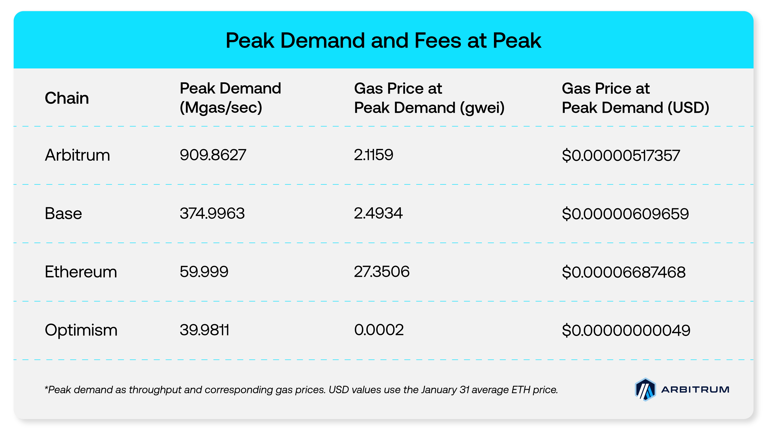 During the Jan 31 congestion window, performance was compared across the top three L2s, Arbitrum, Base, and Optimism, alongside Ethereum L1 for context. Arbitrum experienced the highest peak demand at ~910 Mgas/s, more than 2x Base at ~375 Mgas/s and far above Optimism at ~60 Mgas/s (Ethereum peaked around ~40 Mgas/s). Despite absorbing substantially higher demand, Arbitrum kept median fees at its peak-demand moment in the low single digit gwei range (~2.12 gwei).
