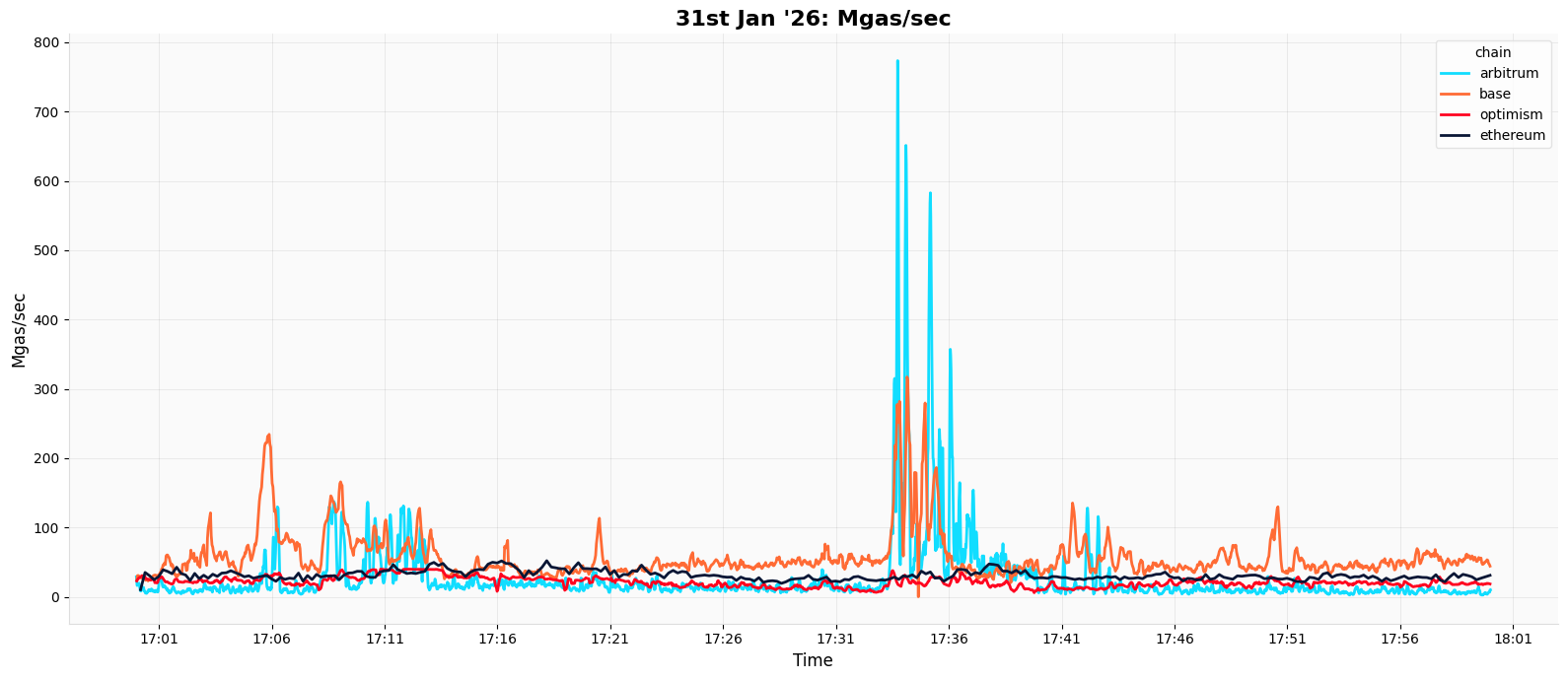 After the cross-chain view sets context, the Jan 31 case study shows Dynamic Pricing in action on a recent day with a particularly high demand profile. These same-period comparisons are directional and do not control for workload mix, fee stack differences, or application composition.