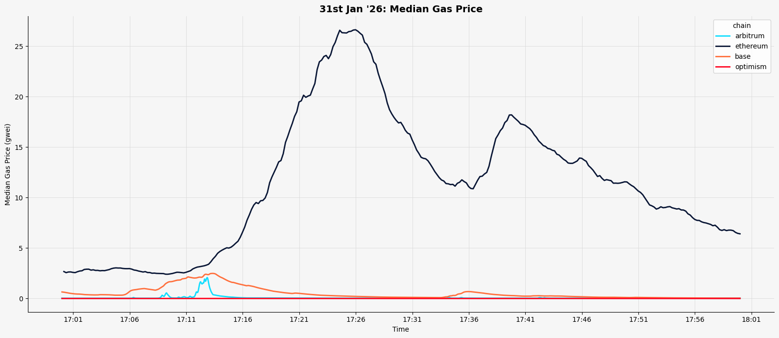 Stress periods are isolated and the fluctuation of median gas prices is quantified. This provides a direct lens on how turbulent fees become when networks are busy. - Replay of a real high-load day (Jan 31, 2026)
