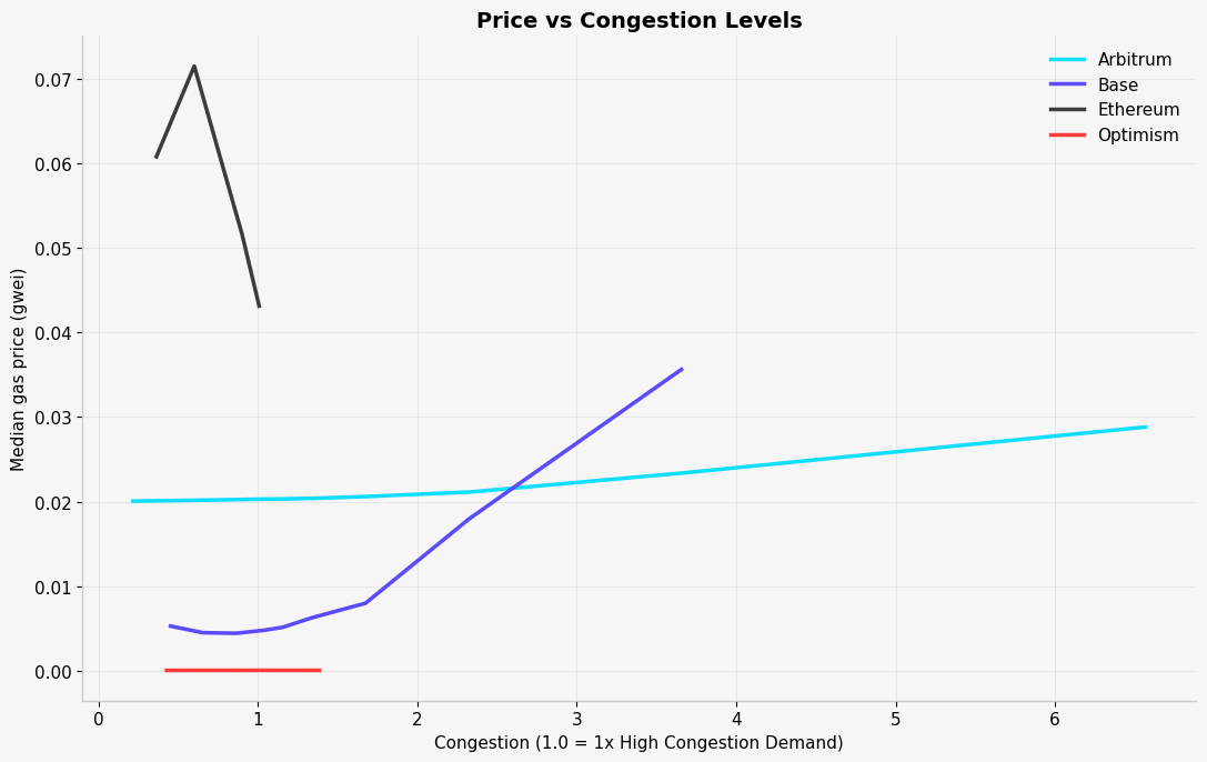 The takeaway is how quickly fees respond as congestion scales. The data shows that Arbitrum’s median gas price increases gradually even at high multiples of p95 demand. Base stays low at first, then rises quickly once congestion begins to climb, indicating a sharper fee spike. Optimism and Ethereum saw much less demand in this window, so there are fewer data points, and Ethereum immediately starts from a higher price level.