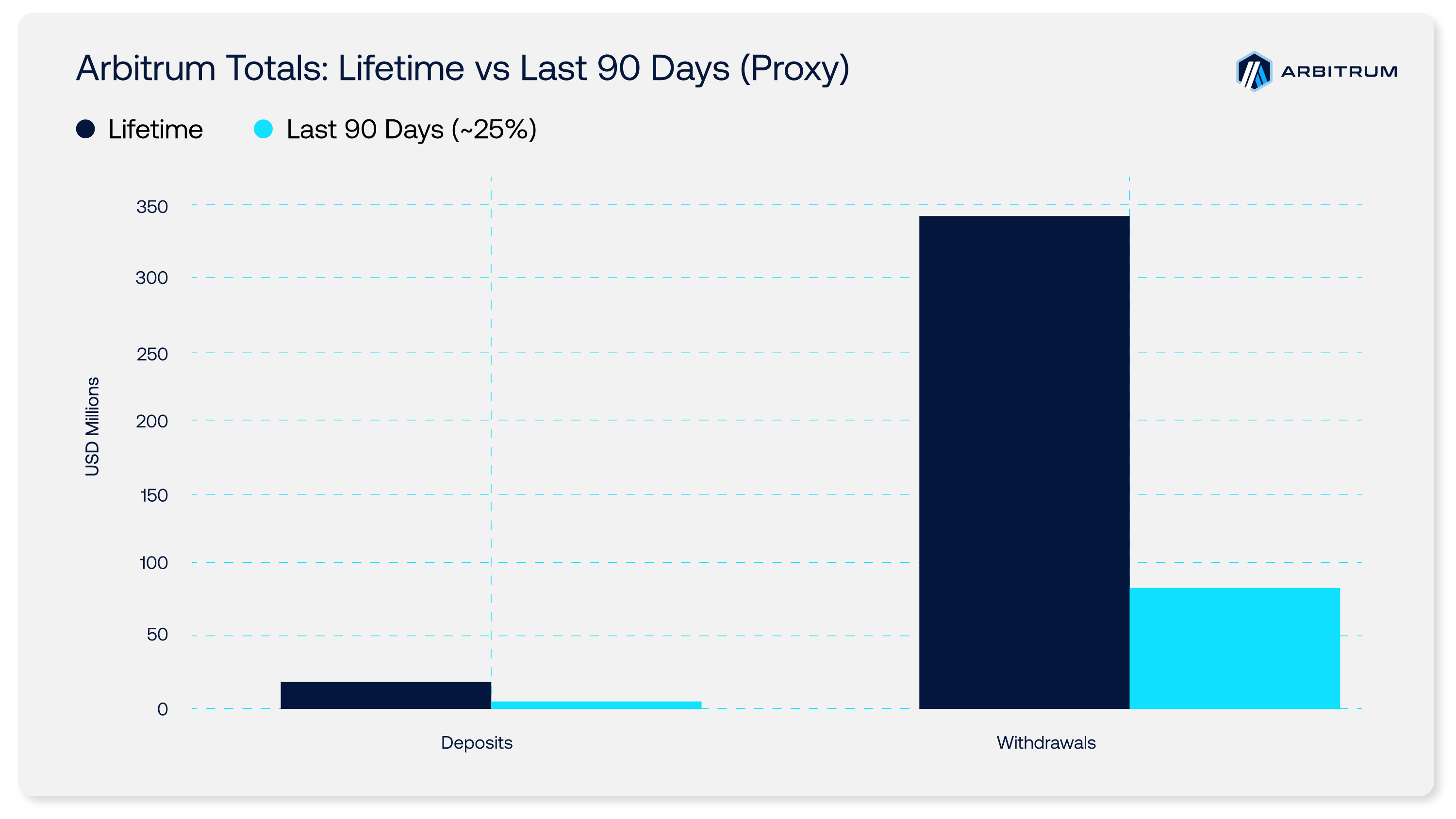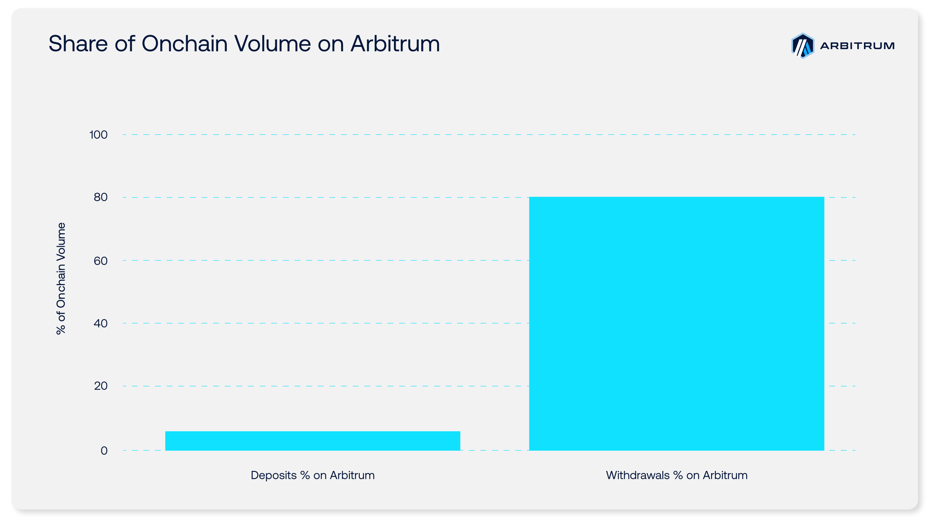 As shown in the figure above, of Rise’s onchain volume, around 80% of all withdrawal volume runs through Arbitrum, while 6% of deposit volume originates there. That pattern indicates that teams can fund from several chains, but when it’s time to pay out, it appears that Arbitrum has become the recipient-preferred payout rail that is fast, inexpensive, and tightly connected to off-ramps.