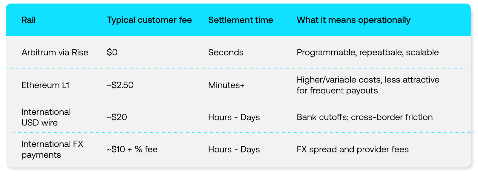 The average Arbitrum payout is $1,500 — large enough that wire/FX fees hurt on legacy rails, small enough that $0 fees on Arbitrum flips the math. Rise makes small and mid-sized disbursements economical, saving up to ~5% vs ACH, wires, and L1 (per Rise).