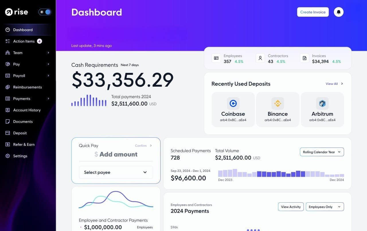 Rise sets out to build a single global payroll infrastructure that pays workers anywhere, compliantly and instantly. A core feature of the platform is native USDC and USDT funding and withdrawals, allowing payers to fund based on their preference while recipients choose the stablecoin that works for them where they live. In practice, USDC tends to dominate in the US, EU, and much of APAC, while USDT is more commonly used across LATAM, Africa, and parts of APAC.